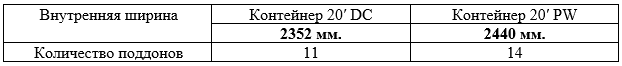 Итак, ширина контейнера 20′ PW позволяет размещать 2 поддона в длину.